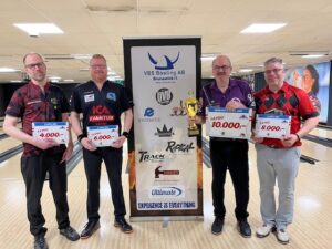 Finaldagen idag startade med 3 serier och där dominerade Mats ”doc” Lunderquist totalt med strålande 748 poäng, kan tillägga att endast 1 slag var inte 9 käglor eller strike, det var en 8a 🙂